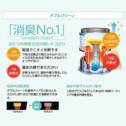 ●トヨトミ独自の燃焼技術で、遠赤効果アップ&ニオイを抑えるダブルクリーン。