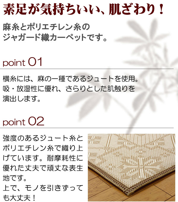 IV(アイボリー) 麻混カーペット 『FXカルチャー』 サイズ 約174×261cm(江戸間3畳) カラー ブラウン/アイボリー 素材 表地: 横糸)指定外繊維【ジュート】100% 縦糸)ポリエチレン100% 裏地:不織布 中材:ウレタンフォーム10mm 原産国 日本製 ■麻糸とポリエチレン糸のジャガード織りのカーペットです。